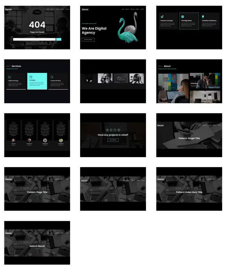 يحتوي Zeever على 13 نمطًا أساسيًا، بما في ذلك صفحة 404 وقسم حول والدعوة إلى اتخاذ إجراء.