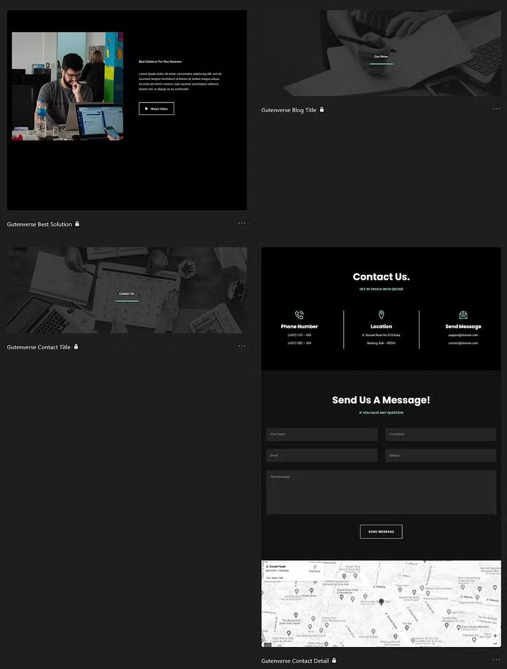 إذا قمت بتثبيت Gutenverse، فلديك 29 نمطًا إضافيًا للعمل بها. يتضمن ذلك قسمًا حول وصفحة اتصل بنا والأسئلة الشائعة ومعارض المشروع.