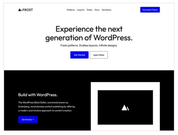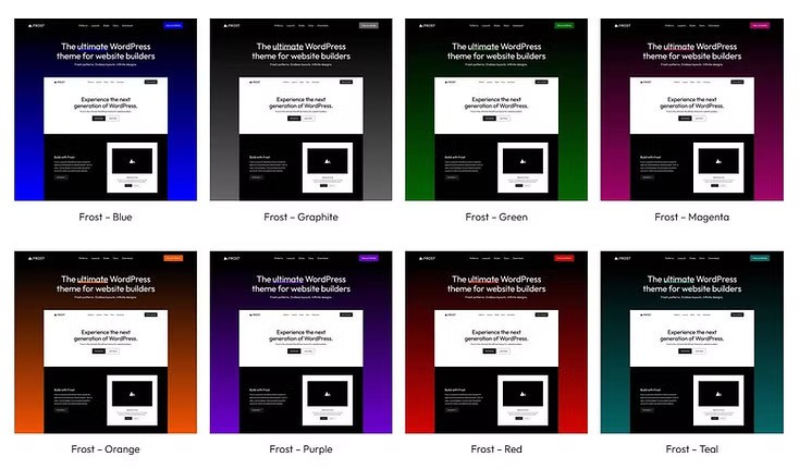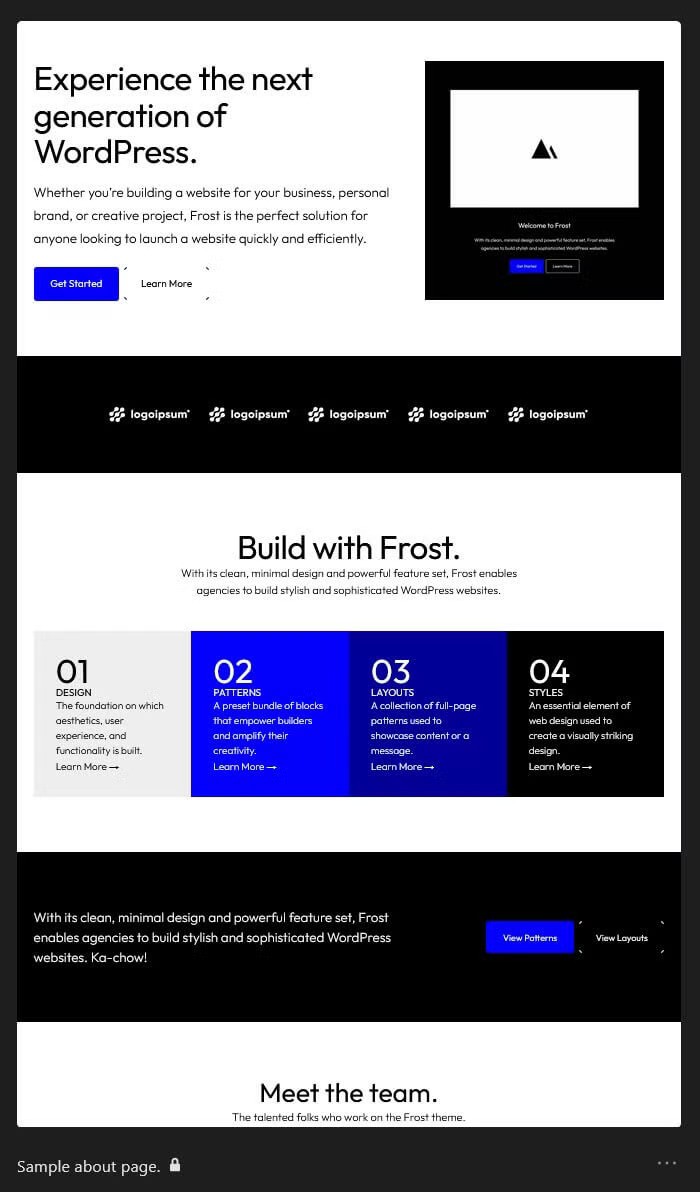 Frost عبارة عن قالب WordPress من WP Engine، مضيف WordPress المُدار الشهير. مع أكثر من 2000 عملية تثبيت نشطة، فهو واحد من أفضل القوالب كتلة WordPress للأشخاص الذين يبحثون عن قالب بداية قوية.