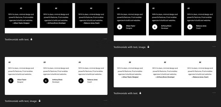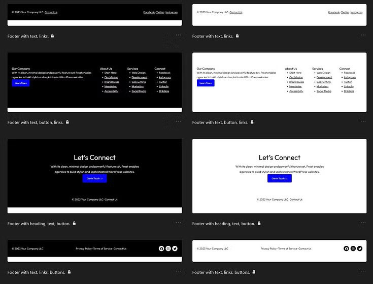 لدى Frost مجموعة جيدة من أنماط الكتل، بما في ذلك جداول التسعير المتعددة والشهادات والعبارات التي تحث المستخدم على اتخاذ إجراء.
