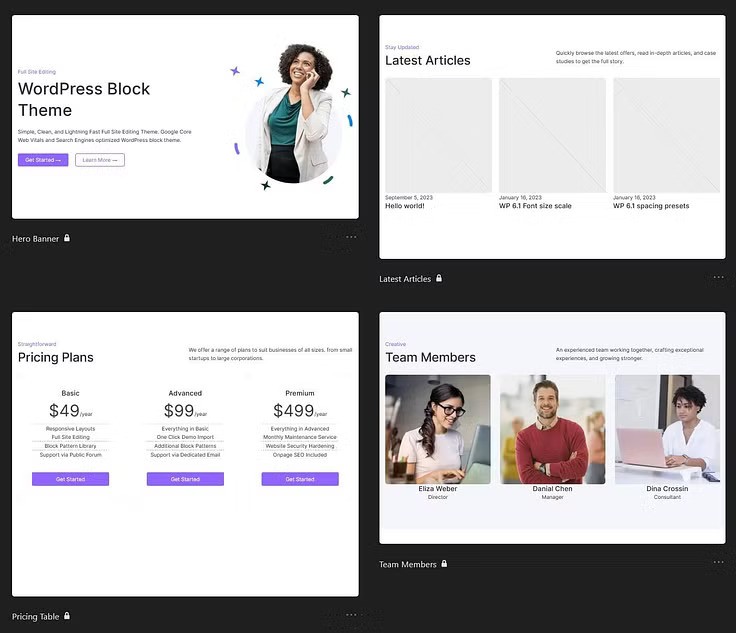 ستتمكن من تصميم قوالب WordPress موقعك باستخدام الكتل مع الوصول أيضًا إلى أشكال مختلفة من الأنماط المعدة مسبقًا لتغيير مظهر موقعك بسرعة. بالإضافة إلى ذلك، فإن كل هذه القوالب تتضمن أيضًا الكثير من أنماط الكتل لمساعدتك على العمل بشكل أكثر كفاءة.