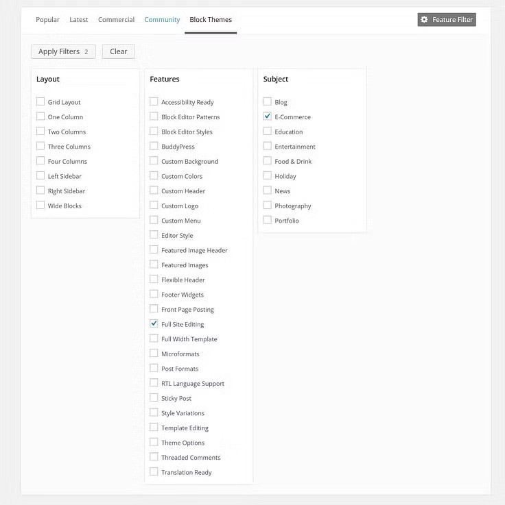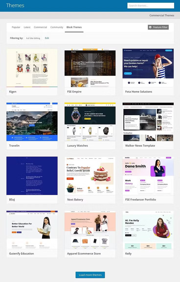 تتم تصفية قائمة القوالب بواسطة علامة Full Site Editing .