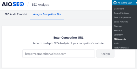 Next, you can head to All in One SEO » SEO Analysis from your WordPress dashboard, and then go to the Competitor Site Analysis tab .