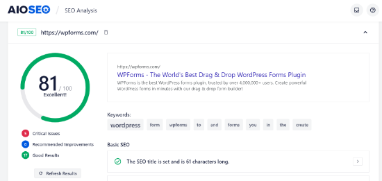 Then, AIOSEO will analyze your competitor’s website based on various criteria. It will highlight critical issues along with things that are working well on their website .