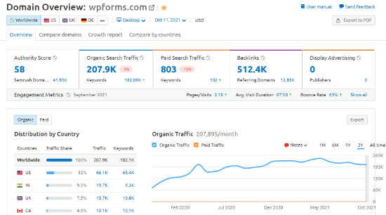 It will also show you which country contributes the largest traffic share, along with a monthly breakdown of organic traffic .