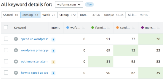 Then, Semrush will display a list of keywords that you and your competitors have in common. The key here is to look at the “missing” keywords report .