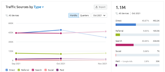 For more detailed analysis, you can go to the “Traffic Analytics” section from the menu on your left. In this section, Semrush gives you a detailed breakdown of your competitors’ traffic sources .