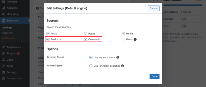 This will bring up a pop-up window where you should make sure that the checkbox next to “products”is checked. This will allow SearchWP to index your WooCommerce products.