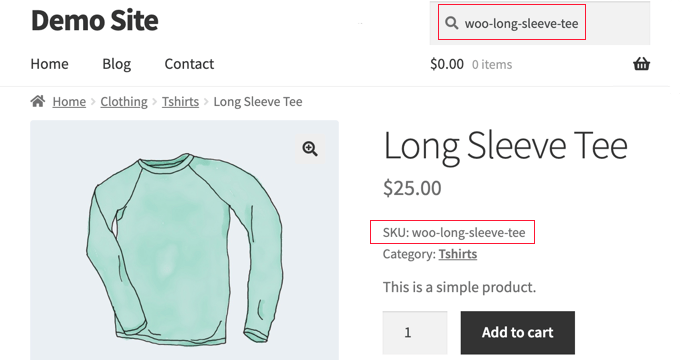 In our demo store, the long-sleeved T-shirt has a SKU “woo-long-sleeve-tee”. When we search for this SKU, the correct product is displayed.